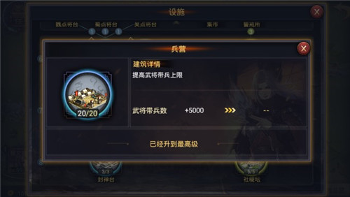 预备役所LV20 3) 兵营:提高武将带兵上限,对增加部队兵力影响巨大。建造条件是城主府LV7,是后期重点发展设施。