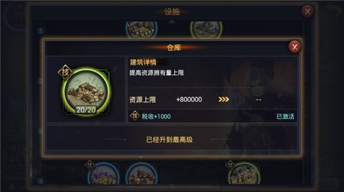 民居LV20 2、提高资源收入:伐木场、炼铁场、磨坊、采石场,分别对应提高木材、铁矿、粮草、石料收入,满级后木材、铁矿额外获得产量+5200,粮草、石料额外获得产量+5500。科技树升级、征兵等都需要消耗资源,前期可侧重升级这几项设施。 3、 资源存储及流通:仓库、集市。 1)仓库:提高资源拥有量上限。基本与提高资源收入的伐木场、炼铁场、磨坊和采石场持平升级即可,满级后资源上限+800000,税收+1000。