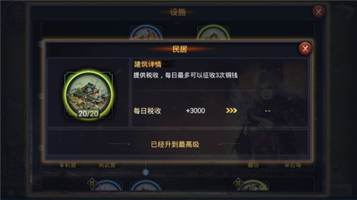 兵营LV20 3、提高部队属性: 疾风营、铁壁营、军机营、尚武营,分别对应提高本城部队的速度、防御、谋略、攻击,满级后各属性加成20。前期按照任务指示稳步进行即可,后期可按照自身判断侧重升级。 4、加成部队阵营: 汉点将台、魏点将台、蜀点将台、群点将台,分别对应开启汉、魏、蜀、群的阵营加成,等级越高,加成效果越强,满级后阵营加成5%,可根据自身部队阵营判断侧重升级。 二、发展城池 1、提高税收收入:民居。 民居:提供税收,每日最多可以征收3次铜钱,必要时可使用玉符强征。前期按照任务指示稳步升级,后期可按实际需要收入进行升级。