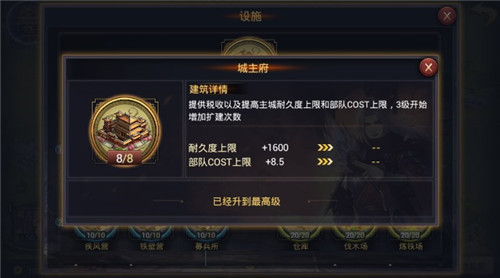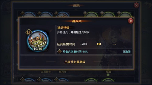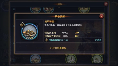 募兵所LV10 2)预备役所:提高预备兵上限以及减少预备兵恢复时间,对及时补充补充兵力影响较大。建造条件是城主府LV6,偏后期重点发展设施。