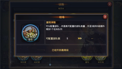 校场LV5 2)统帅厅:使部队可配置前锋,并提高可配置前锋的部队数量。等级越高,可配置前锋的部队数量越多,上限为5个部队全部配置前锋。前期不着急升级,可先解锁主力部队前锋配置。 2、增加部队兵力:募兵所、预备役所、兵营。 1)募兵所:开启征兵功能,并缩短征兵时间,满级激活缩短预备兵恢复时间。募兵所升级前期资源需求量较少,可按照任务指示节奏升级。