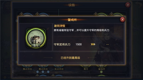 仓库LV20 2)集市:进行资源之间的交易,提高交易兑换率,建造后交易比率+10%。某一项资源特别紧缺时,集市具有现实意义,资源充足时可提前建造集市。 4、增强城池防御:城墙、警戒所、烽火台、武神巨像、沙盘阵图。 1)城墙:提高城区耐久度上限。升级所需资源较多,可按照任务提示稳步升级。 2)警戒所:使城池拥有城墙常驻守军,升级可以提升守军的等级和兵力,满级守军武将兵力是1500,是偏后期重点发展设施。