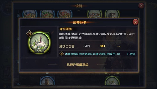 警戒所LV5 3)烽火台:增加预警时间,更快发现敌袭部队,满级预警时间+1200秒,可按照任务指示稳步升级。 4)武神巨像:降低本城及城区的待命部队和驻守部队受到攻击的伤害,满级受攻击伤害-20%,同时激活攻击+10,是后期重点发展设施。