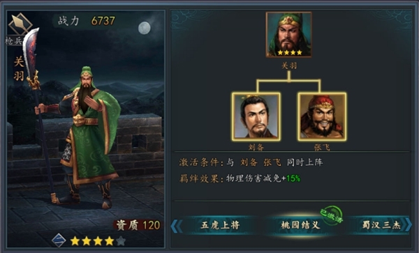 其次是装备的共鸣,当所有的装备都强化到一定等级时,即可激活共鸣,为角色增加额外的属性。共鸣也有等级之分,强化的等级越高,所激活的属性就会越大哦。除此之外,还有角色自带的羁绊加成,当上阵角色与羁绊关系的武将同时上阵时,则可激活羁绊关系,增加不同程度的加成效果。如同时上阵关羽、刘备、张飞,即激活“桃园结义”的羁绊关系,增加角色物理免伤15%哦。