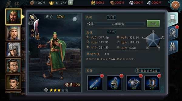 既然是单刀上阵,那么个人英雄主义之火冉冉升起的同时,这把刀你得磨利。在《三国志2017》中,如果有幸将关羽收入麾下的话,那一定不要吝惜角色和装备的强化。游戏中武将强化的表现分三种:一是角色的升星,分五阶共25个星级,玩家通关副本获得的材料和铜钱是必要的升星材料。