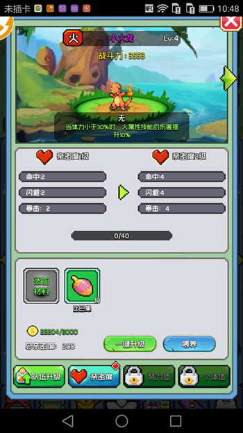 精灵的亲密度影响精灵的战斗属性,亲密度越高,提升的属性就越强。提升亲密度需要耗费金币和比巴果,这些可以在冒险中获得。