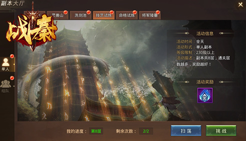 一、开启等级: 角色≥190级 二、参与条件: 无限制 三、玩法介绍: 1 技艺试炼副本只能组队挑战 2 副本总共有8关 3 S级评价通关当前关卡,可自动进入下一关;否则挑战结束,获得通关奖励 4 玩..